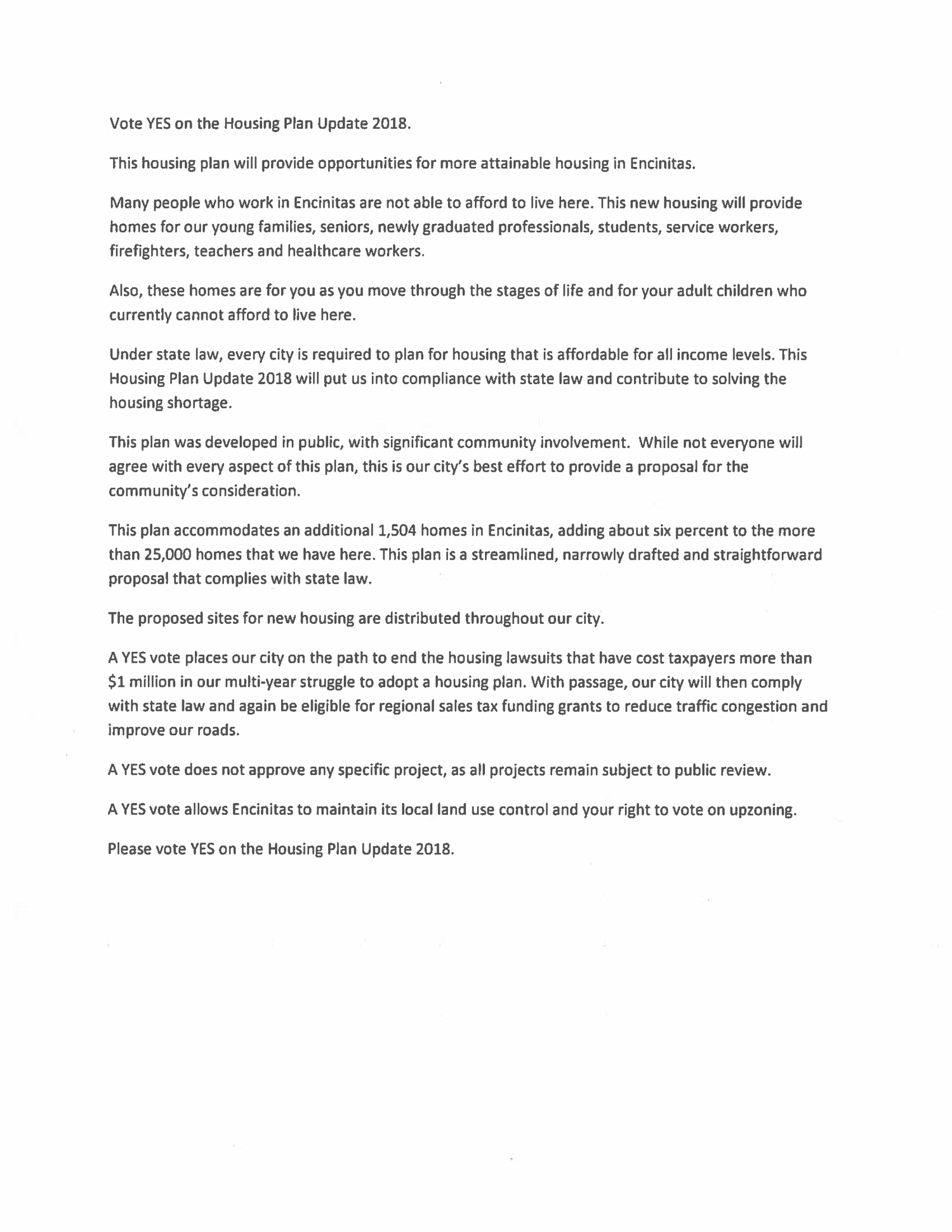 ▪ They claim that we won’t lose our control of local zoning or housing development decisions – UNKNOWN. We go before the judge/court on November 13th. The judge will decide the outcome of the 2 lawsuits still in place. He will have given us 2 chances at that point to have the people decide via Measure T and now Measure U. State law dictates EVERY city have an approved Housing Element. There is quite a bit of Case Law that shows the courts support State Law. . . None of us know what he will do for sure. The unknown aspect of this is very scary and puts our control in the courts hands.