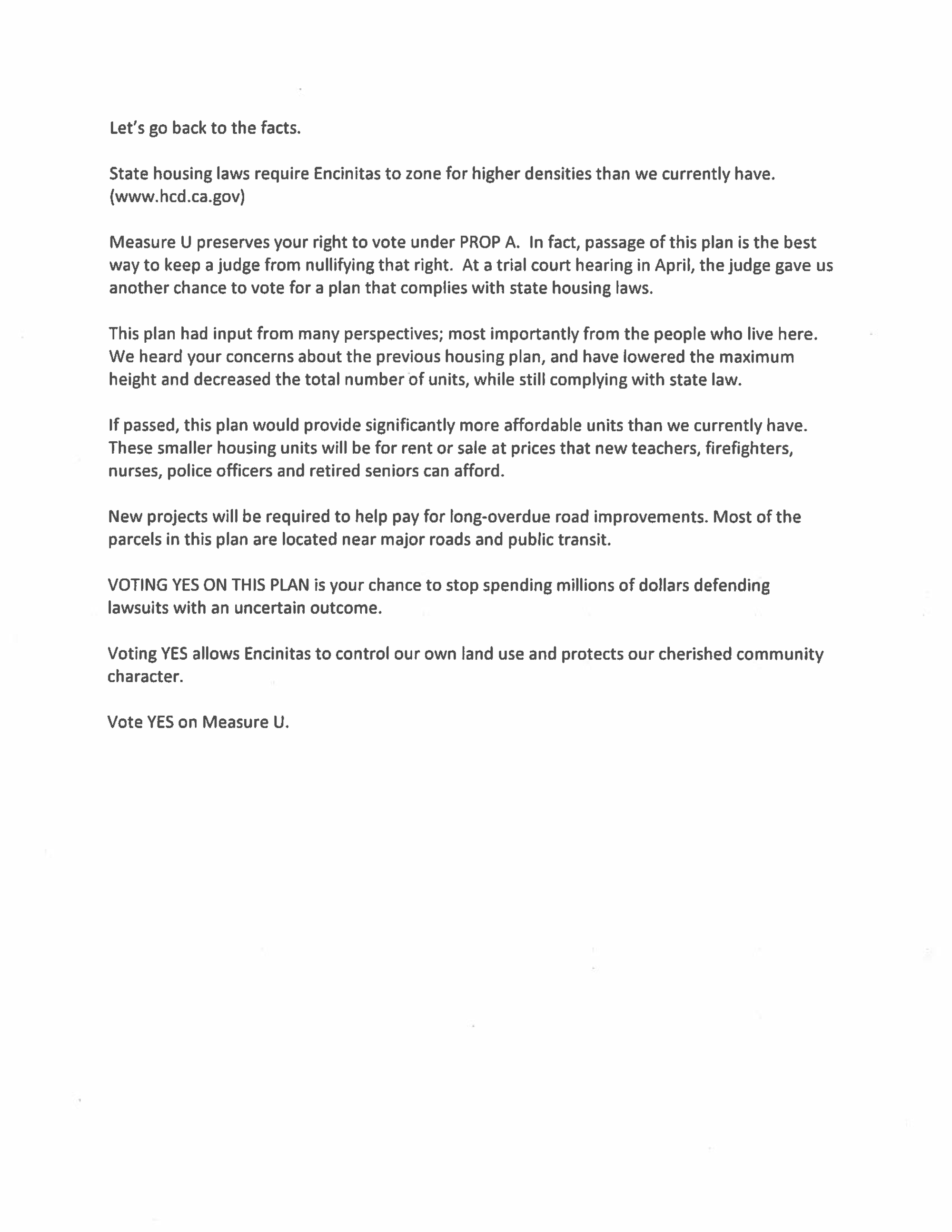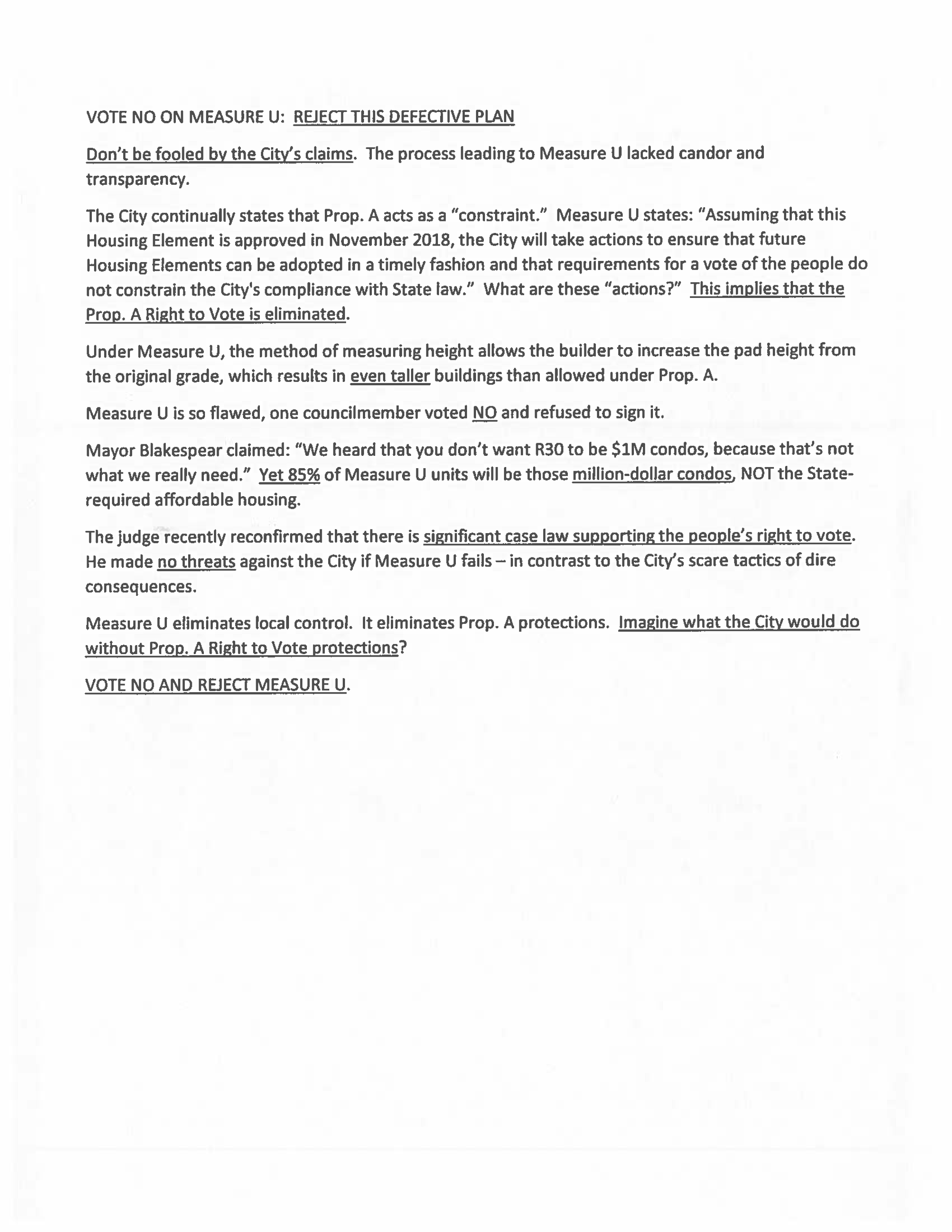 Yes on U: Here are the rebuttal points to the 'No On Measure U' propaganda out there. The facts to dispute their claims are as follows - ▪ They claim heights go to 4 stories – FALSE. The cap on Measure U sites is 3 stories, no higher. (This is the most frustrating ABSOLUTE LIE they are spewing. . . ). ▪ They claim heights go up to 42 feet – MISLEADING. The 15 sites can go up to 33 feet for a flat roof and 37 feet for a peaked roof. There is an additional 5’ ONLY FOR EQUIPMENT (such as heating, air conditioning, venting, elevators, etc.) but the extra 5’ is limited to no more than 25% of the top floor coverage with a minimum of 10’ setback and is EXCLUSIVELY for equipment.